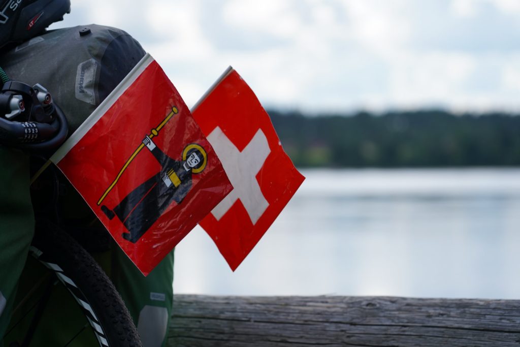 Immerhin sind pünktlich zum 1. August endlich die Fahnen am Fahrrad montiert.