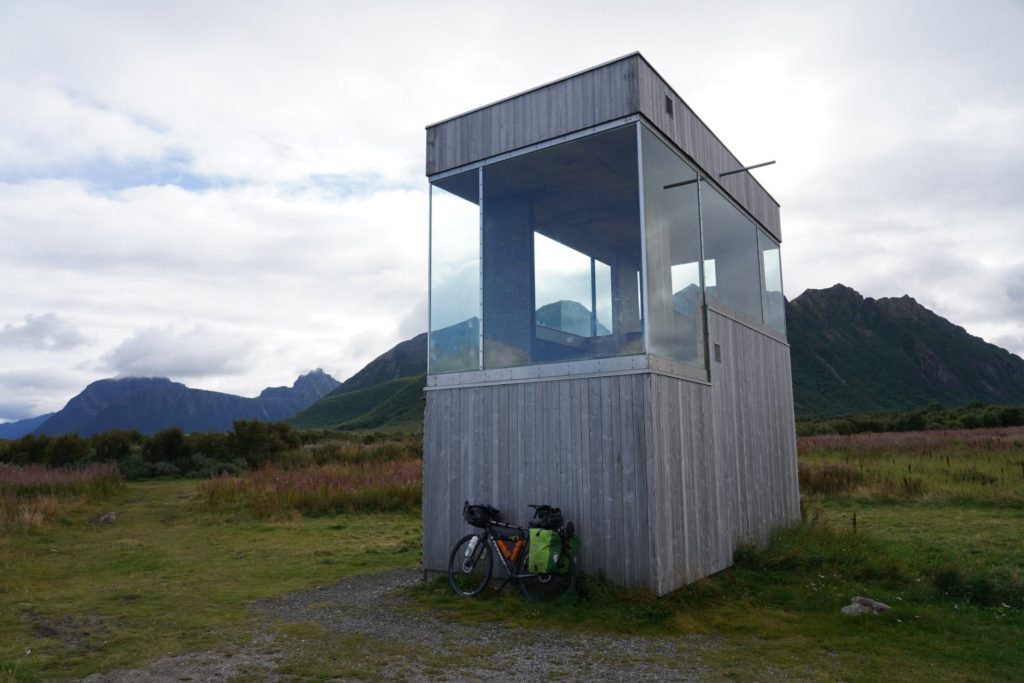 Am Anfang ging es entlang des Meeres auf einer kleinen «Nebenstrasse» und es kam langsam wieder ein Müü Motivation in mir auf. Pünktlich zur Mittagszeit erreichte ich einen Rastplatz/eine Sehenswürdigkeit. Abgesehen von der modernen Bauweise des Rastplatzes und eines kleinen Leuchtturms gabs da allerdings nicht viel Besonderes zu sehen. Abgesehen von der Wand des WCs, welche sich beim Betreten in ein Fenster verwandelte, ohne dass jemand von draussen hineinsehen konnte. Ich machte ein paar Fotos des Leuchtturms und genoss mein Mittagessen.