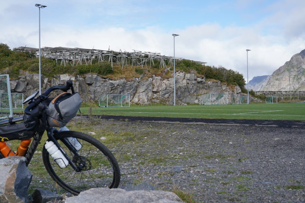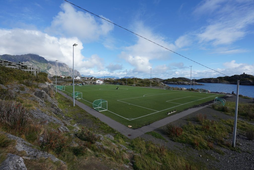 Zurück beim Rad gings vom Start des Wanderwegs wenige Kilometer ins Zentrum von «Henningsvaer» um den vermutlich bekanntesten Fussballplatz anzusehen. In der Zwischenzeit ziemlich hungrig, genoss ich mein Mittagassen zum Gesang von mehreren Drohnen.