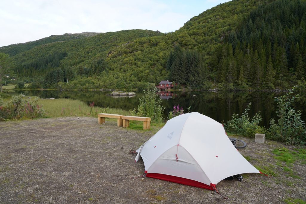 Ein Stellplatz für den Camper zu finden ist nicht besonders schwierig. Es hat zahlreiche «Parkplätze» oder Aussparungen, in welche man sich hineinstellen kann. Mit dem Zelt wird es aber teilweise etwas schwieriger. Man braucht einen flachen Untergrund und am besten etwas Wiese und kein Parkplatz. Trotz diesen Ansprüchen fand ich einen geeigneten Platz zwischen zwei umgefallenen Bäumen und baute mein Zelt auf. Dem abgedrückten Gras nach, war ich nicht der einzige mit Zelt an diesem Ort.