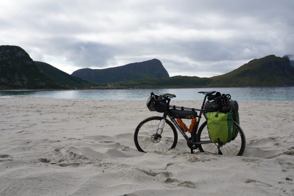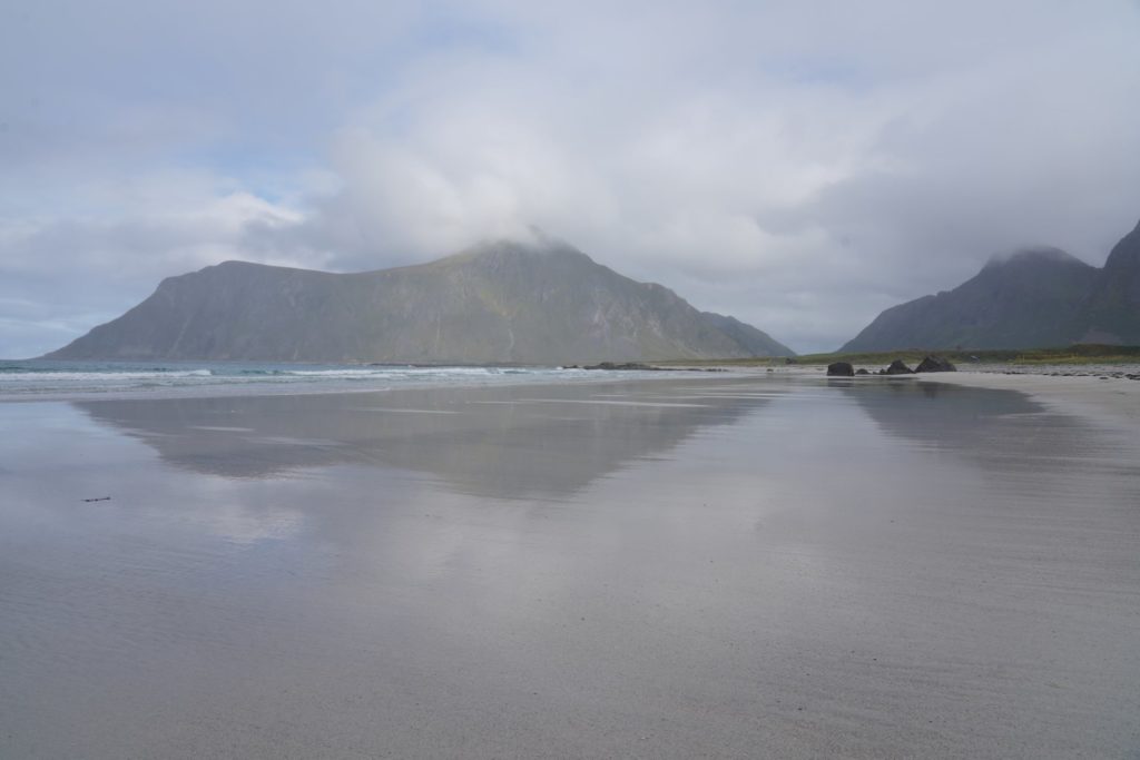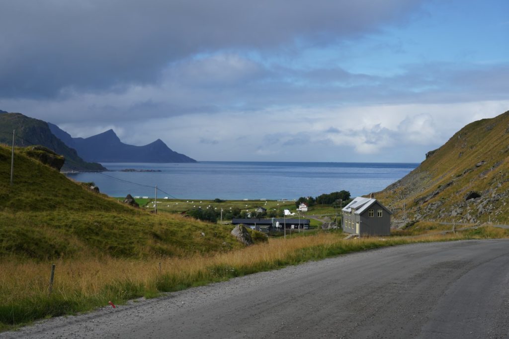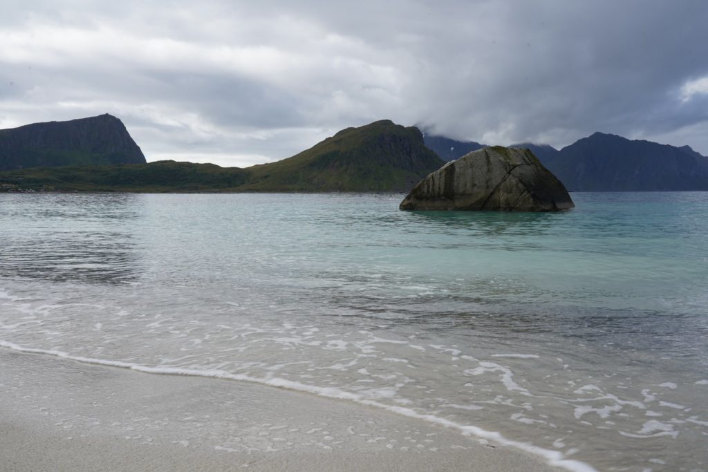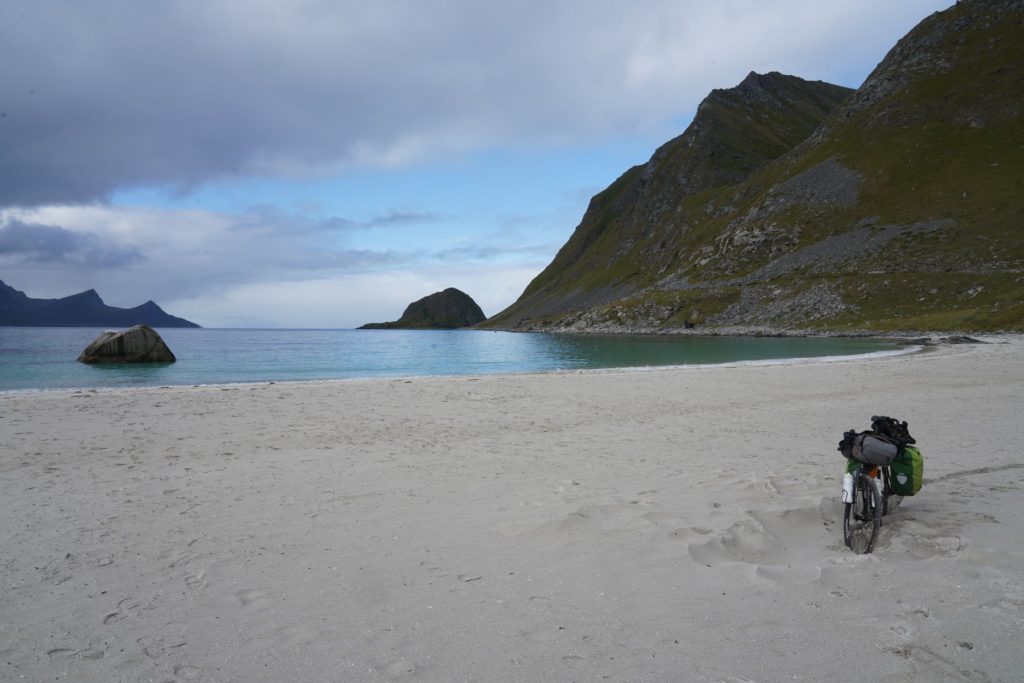 Mit motivierender Musik im Ohr machte ich mich also auf die letzten etwa 80km in Richtung Entspannung. Auf diesen Inseln gibt es zahlreiche Strände, die man anscheinend gesehen haben muss. Ich fuhr also einen «kleinen» Umweg zum Haukland Strand, um wenigstens einen davon gesehen zu haben. Verstanden wieso man diesen gesehen haben muss, habe ich trotzdem nicht, aber immerhin war ich da und musste mich für einige Kilometer nicht auf der Hauptstrasse ärgern.